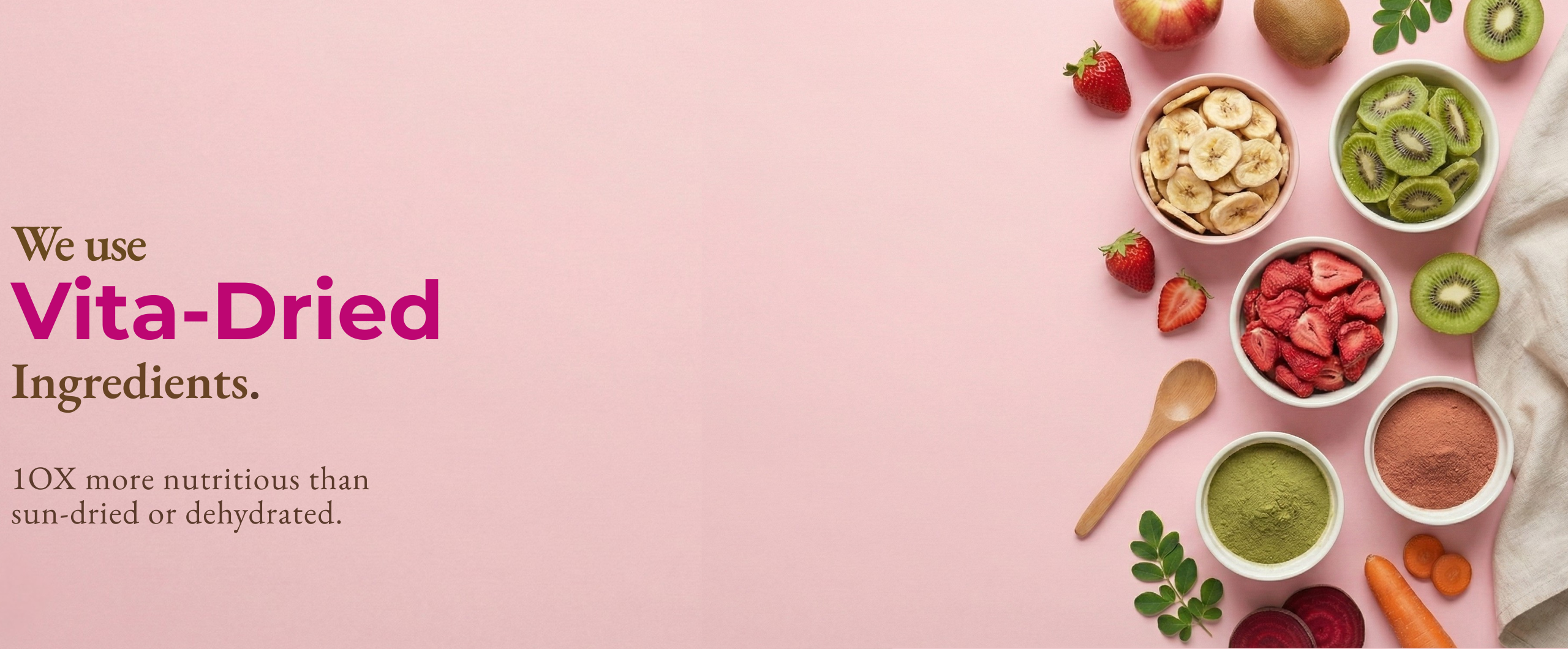 We use Vita-Drying technology because we were tired of 'healthy' foods that weren't actually healthy. Our process preserves 10X more nutrients than Sun-drying and Dehydrating. You'll see the difference in the color, aroma and taste. You'll feel the difference in your health.